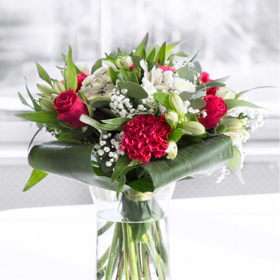 Immerse yourself in the beauty and uniqueness of our Stunning Elegance Bouquet. This exquisite arrangement showcases luxurious red roses intertwined with sweet white chrysanthemums and delicate gypsophila, creating a harmonious blend of colors and textures.